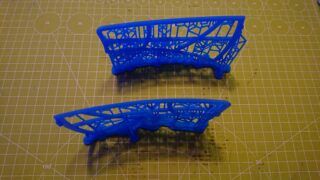 Der Druck lief problemlos ab; beim Entfernen der ungehärteten Werkstücke (linke und rechte Hälfte) von der Plattform brach ein Teil der Stützstrukturen ab. Dies war allerdings unproblematisch, da das Teil die 50 Minuten bei 60°C im Postprocessing dennoch stand und die Stützen sowieso entfernt werden müssen.