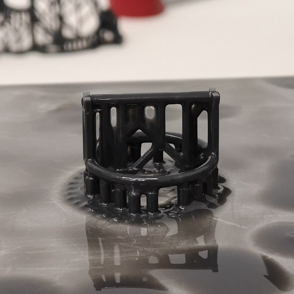 Im ersten Bild sieht man den Druck wie er aus dem Drucker kommt mit Gerüst und auf dem Tisch. Der Dichtring wurde nicht nachgehärtet sondern lediglich im Ultraschallbad gesäubert.