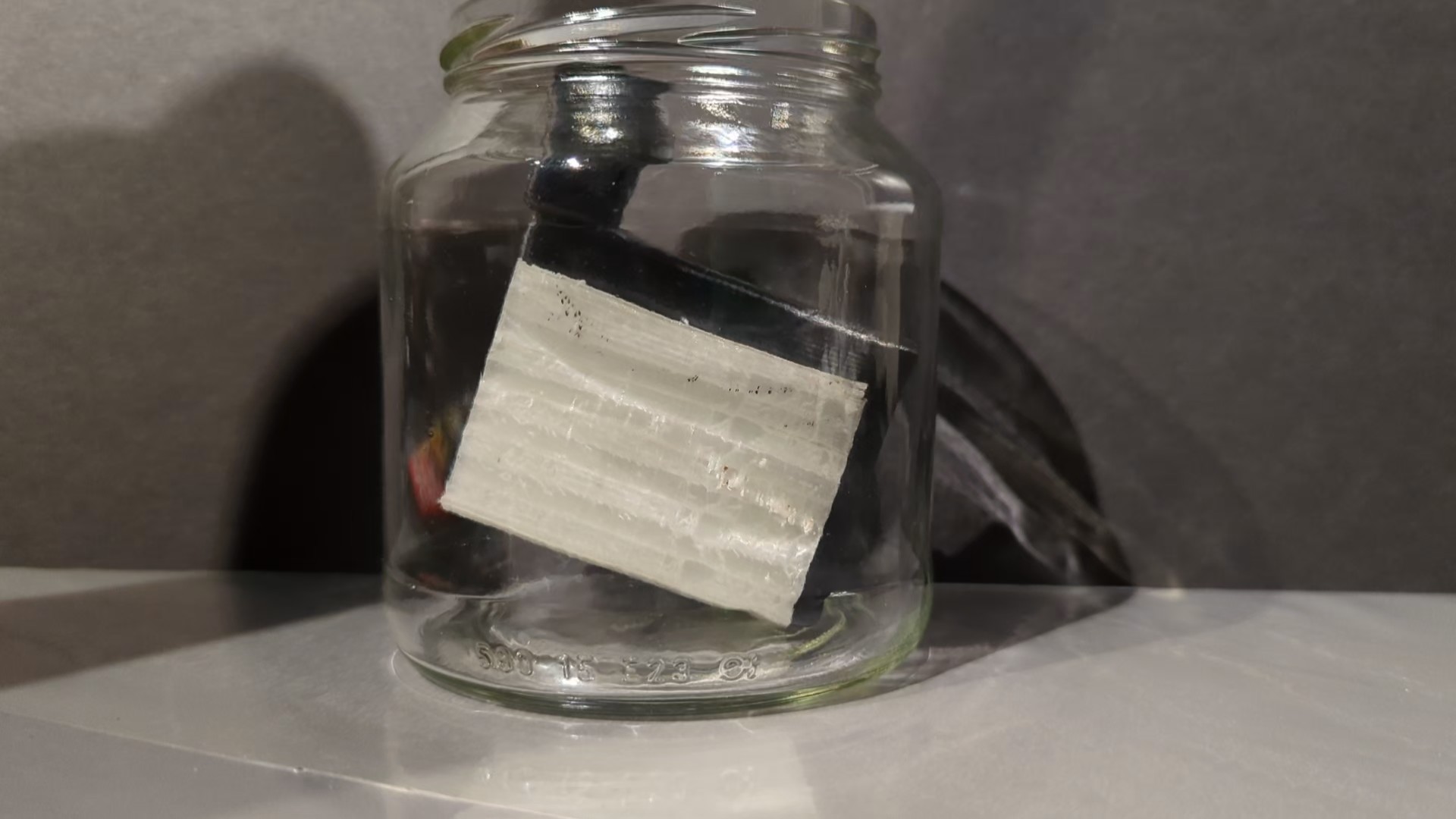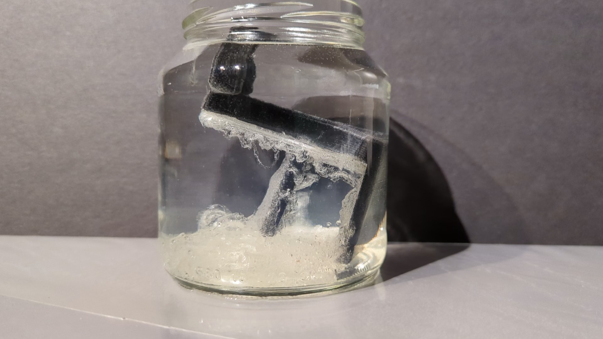 Durch die Verwendung von einer wasserlöslichen Stützstruktur, kann diese einfach entfernt werden, indem das fertige Objekt für einige Zeit ins Wasser gelegt wird (siehe Bilder).