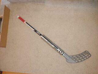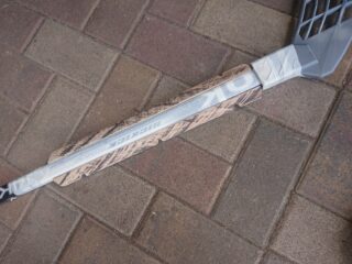 Um den Schläger nun zu vollenden, wurden zwei Holzleisten schräg zugesägt und an der unteren Hälfte des Schafts gegenüberliegend angeschraubt. Anschließend wurden die Leisten noch farblich passend lackiert. Wenn sich der Schläger im Spiel etabliert, ist eine Umsetzung der Leisten in etwas besserer Form und mit geringerem Gewicht ebenso wie die Kelle aus PP denkbar.